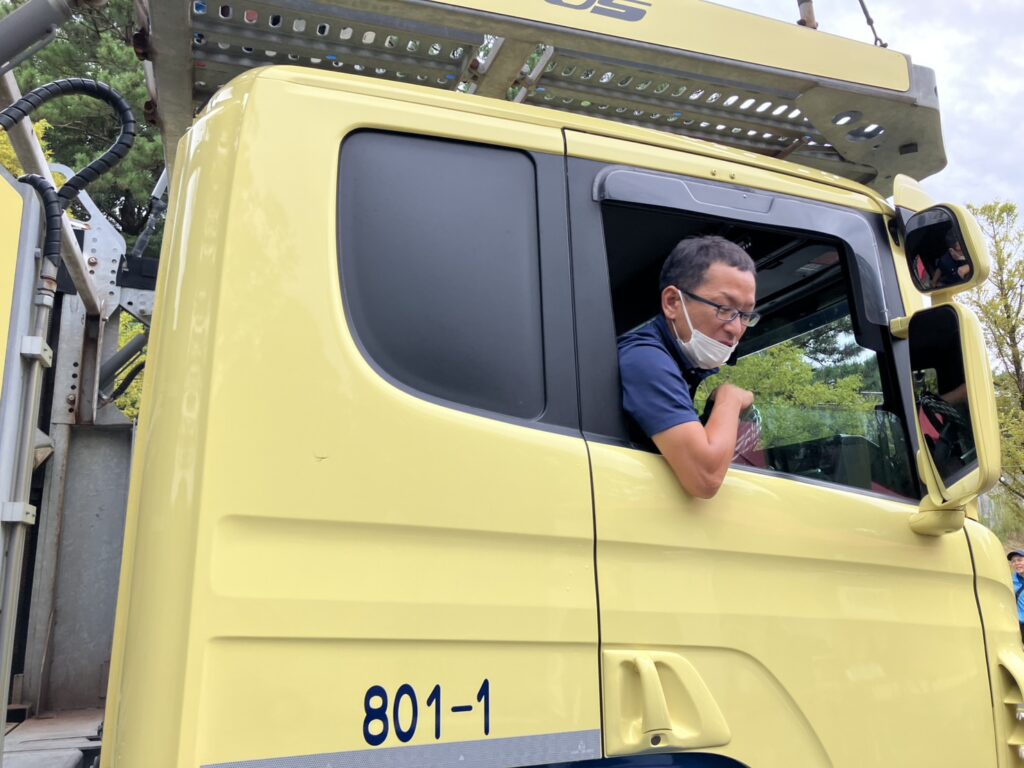 トレーラーを搬入する西尾ドライバー、いつになく真剣です。